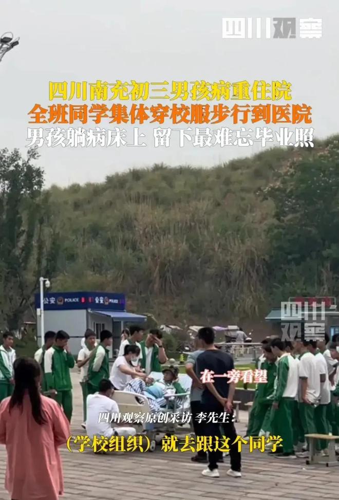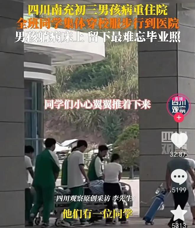 五月的风里总带着点离别的味道,初三的孩子们忙着写同学录、拍毕业照,可四川南充仪陇县的一群初中生,却在医院广场上留下了一张让全网破防的合影。几十张青春的面孔里,有个穿着病号服的男孩被簇拥在中间,身后是斑驳的树影和医院大楼略显冰冷的玻璃幕墙——这是他们用特殊方式定格的少年时光。
