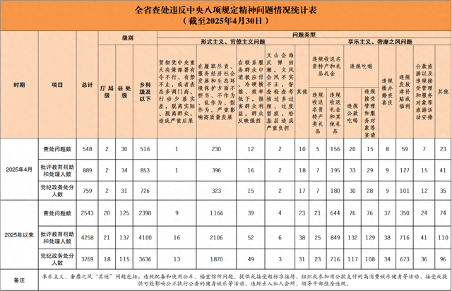2025年4月全省查处违反中央八项规定精神问题548起
