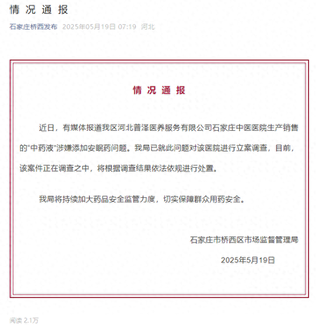 据中共石家庄市桥西区委宣传部官方微信公众号消息,石家庄市桥西区市场监督管理局19日发布情况通报称,近日,有媒体报道桥西区河北普泽医养服务有限公司石家庄中医医院生产销售的“中药液”涉嫌添加安眠药问题。石家庄市桥西区市场监督管理局已就此问题对该医院进行立案调查,目前,该案件正在调查之中,将根据调查结果依法依规进行处置。