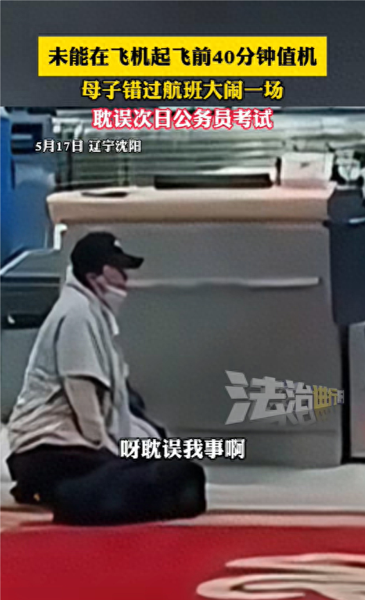 视频显示,5月17日,在辽宁沈阳桃仙国际机场,一对母子未能在飞机起飞前40分钟值机,因错过航班大闹机场,女子称耽误孩子第二天公务员考试。