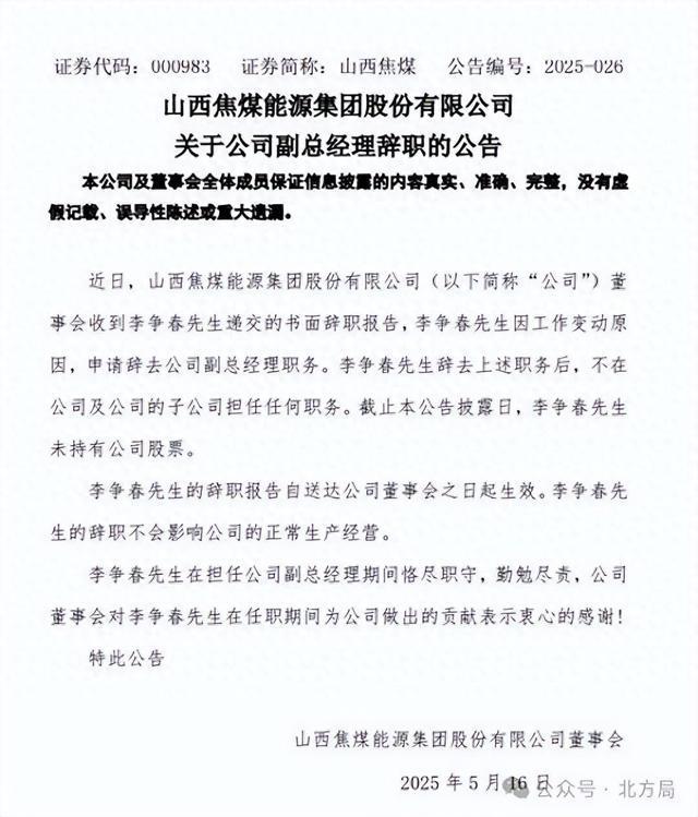 李争春辞去山西焦煤副总经理职务 访客 2025-05-20 259 抢沙发 默认 中国能源报5月16日,山西焦煤发布公告称,近日,公司董事会收到李争春先生递交的书面辞职报告,李争春先生因工作变动原因,申请辞去公司副总经理职务。李争春先生辞去上述职务后,不在公司及公司的子公司担任任何职务。 标签: 职务 先生 海报 阅读 QQ 分享 微博分享 微信分享 分享 上一篇半年不到再换岗:伊春市委常委、政法委书记方春彪任伊春森工集团党委书记 下一篇赵峰、冯身洪,职务调整 半年不到再换岗:伊春市委常委、政法委书记方春彪任伊春森工集团党委书记上一篇 赵峰、冯身洪,职务调整下一篇 相关推荐 职务先生 中证500股票概览,精选优质股票一览表 2026-01-13 商人充当徐宪平管家,专职司机贴身跟随 2026-01-13 日本第一代不婚族开始后悔,婚恋观念的转变与人生反思 2026-01-13 人民币对美元汇率走势分析 2026-01-13 多地医保政策大幅优化,产检报销额度显著提升 2026-01-13 南岭民爆(股票代码,002096)股票分析 2026-01-13 贪官带商行踪揭秘,腐败背后的利益链与权力游戏 2026-01-13 年猪爆火带动博主报价,1分钟视频达2400元 2026-01-13 发表评论取消回复 快捷回复: 评论列表 (暂无评论,259人围观)参与讨论 还没有评论,来说两句吧...
