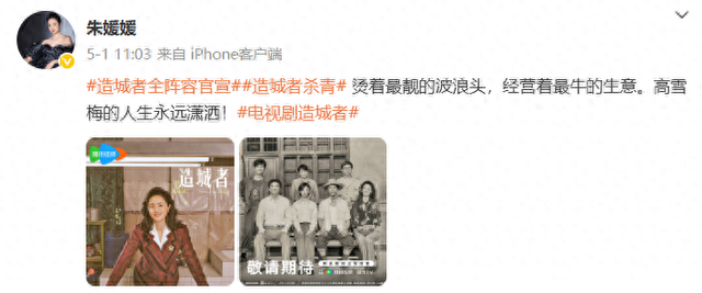 近年来,朱媛媛一直有作品在播出。最近一部杀青的作品是电视剧《造城者》,赵丽颖、黄晓明主演,朱媛媛饰演角色高雪梅,是该剧的领衔主演之一。