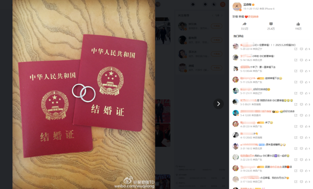 目前,吴奇隆官宣结婚微博未删除