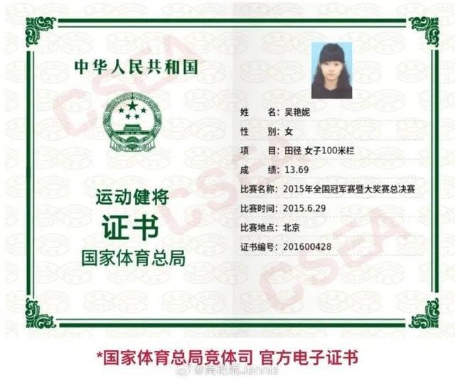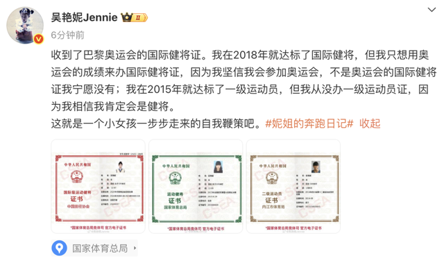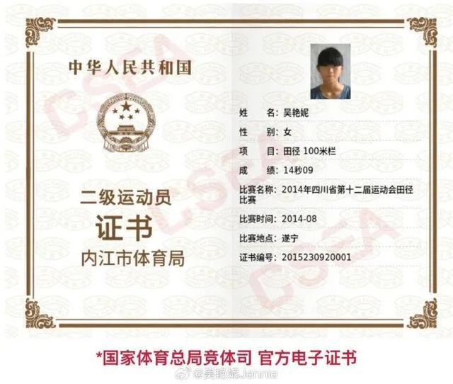 吴艳妮还晒出了自己获得的运动健将证书和二级运动员证书。