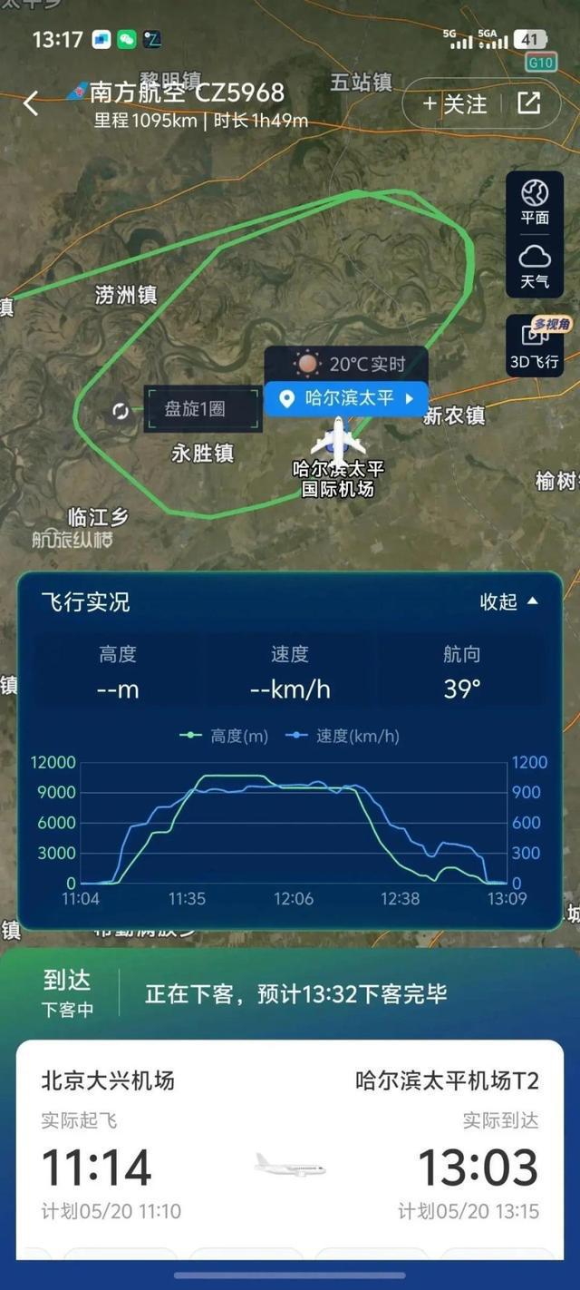 航旅纵横信息显示,该航班于5月20日11时14分从北京大兴机场起飞,13时3分到达哈尔滨太平机场,比计划还提早了13分钟。第一次降落前发生6次重度颠簸、2次中度颠簸、1次轻度颠簸,触地复飞后发生1次中度颠簸,在机场盘旋1圈。