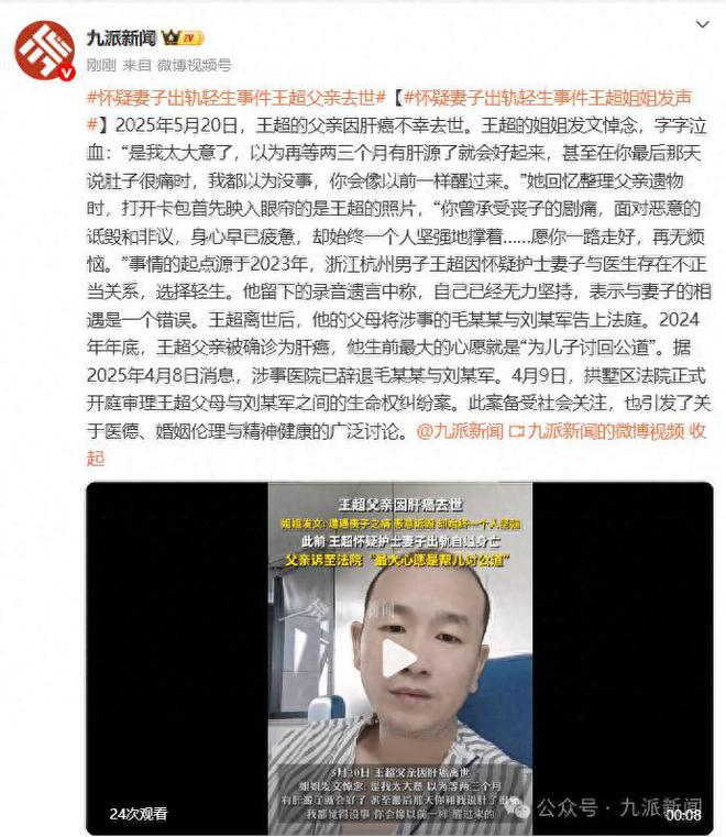 今天,网上有个事儿看得人心里堵得慌——杭州小伙王超因为妻子出轨自杀,他爸为了讨公道硬是熬到肝癌晚期去世,姐弟俩最后连个道歉都没等到。这事儿说起来就像电视剧里的苦情戏,可偏偏就发生在现实里,把网友们的情绪都给点燃了,咱们今天就来唠唠这背后的憋屈事。