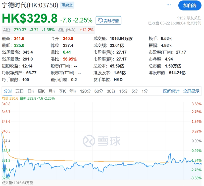 截至今天收盘,宁德时代港股下跌2.25%,报329.8港元/股。