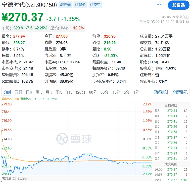 作为对比,宁德时代A股今日盘收270.37元/股,跌了1.35%。不过,近一年该股涨幅高达35.24%。