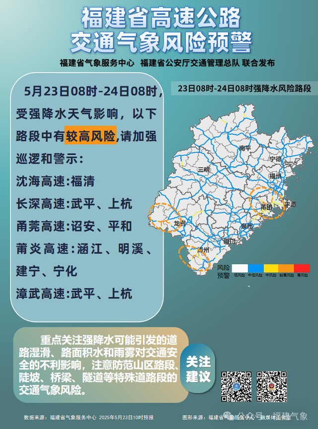 预计,5月23日白天到夜间,福州市晋安区、闽侯县、连江县、闽清县、永泰县、福清市,莆田市仙游县,三明市尤溪县,泉州市安溪县、永春县、德化县,南平市浦城县、光泽县、政和县、武夷山市,宁德市蕉城区、古田县、屏南县、寿宁县、周宁县、福安市、福鼎市等部分地区,地质灾害气象风险等级较高,地质灾害发生可能性较大,应加强对地质灾害隐患点的监测和对高陡边坡、易发泥石流的沟口等易发区的巡查和防范,如果发现地灾险情应及时采取防灾避险措施,确保人民生命安全。