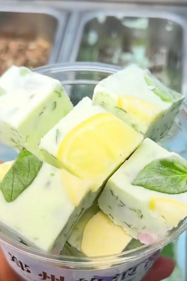 酸奶的酸甜冰爽加上荆芥的独特风味,在炒酸奶机里一搅和,做成一块块的炒酸奶块。拿在手里,冰冰凉凉的,吃进嘴里,酸奶的醇厚和荆芥的清爽交织在一起,仿佛在嘴里开了一场奇妙的冰雪派对,每一口都是满满的惊喜。