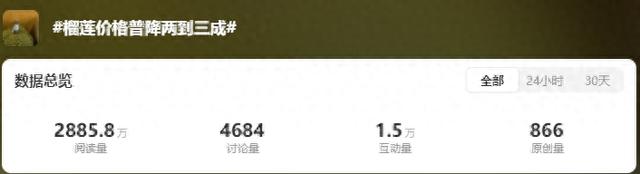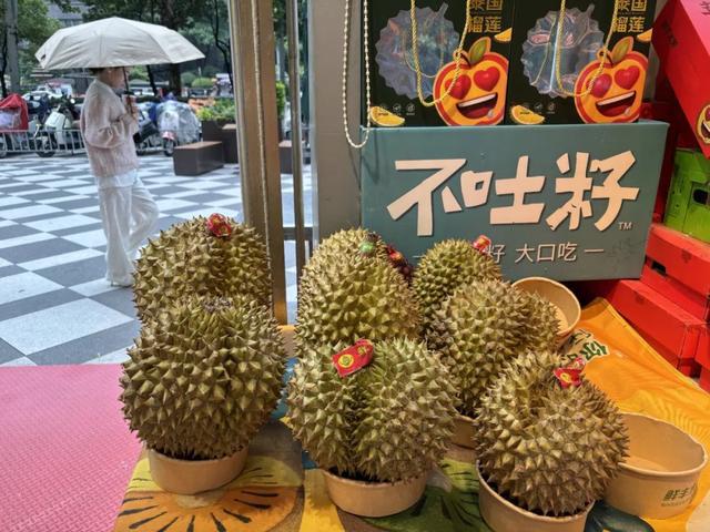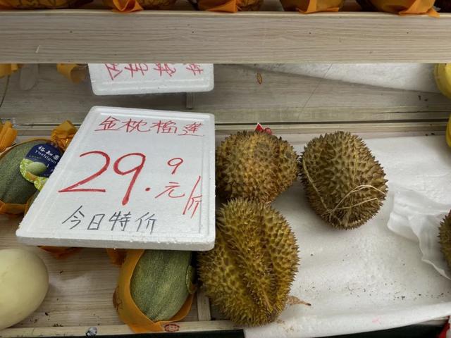 在一家“鲜丰水果店”里,记者没有找到金枕榴莲的身影,正在售卖的是一种叫“金荛榴莲”的品种,产自越南,目前特价79元/3斤,超过3斤的部分按照35.8元/斤售卖。店家同样表示,对比前段时间,榴莲价格下降不少,“之前金枕榴莲卖到40-50元/斤,现在价格也只有30多元了。”