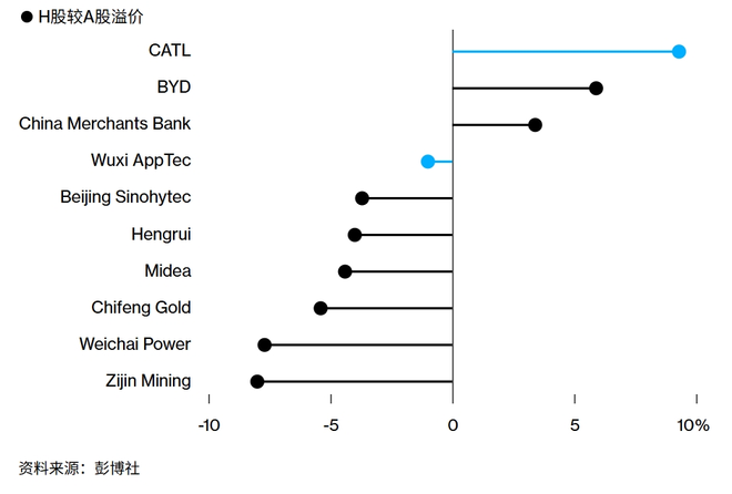 据彭博汇编的数据,在香港和内地上市的近150家公司中,目前只有宁德时代、比亚迪和招商银行的H股相较于A股存在溢价。