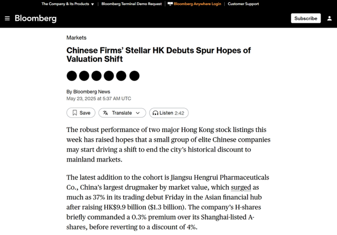 据彭博社周五报道,本周香港两家大型股票上市后的强劲表现引发人们的希望,即一小部分中国顶尖公司可能开始推动一场变革,结束香港股市多年来相对于内地市场的折价现象。