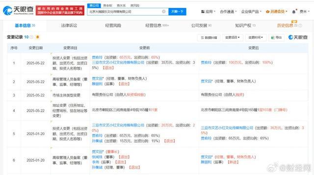 5月26日,据财经网消息,天眼查App显示,近日,北京大碗娱乐文化传媒有限公司发生工商变更,原股东三亚市文艺小红文化传媒有限公司退出,现由贾俞玲(贾玲)全资持股。