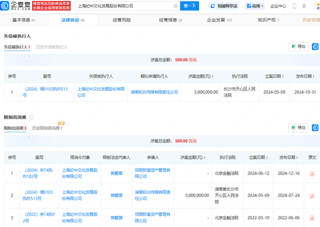企查查APP显示,近日,上海纪中文化发展股份有限公司公布2024年年报。根据年报最新公示的股东信息显示,目前该公司第一大股东为樊馨蔓(张纪中前妻),持股85.34%,张纪中已不在股东行列。上海纪中文化发展股份有限公司成立于2012年12月,法定代表人为樊馨蔓,注册资本3000万人民币,由樊馨蔓、嘉兴硅谷天堂嘉中投资合伙企业(有限合伙)等共同持股。企查查风险信息显示,该公司存在多条限制消费令、失信被执行人(老赖)信息,并已申请破产。此前,张纪中曾在微博发布说明,称自2017年离婚以后,已彻底离开上海纪中文化发展股份有限公司。