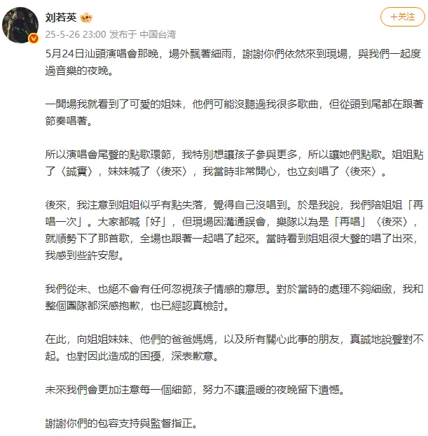 5月26日深夜,刘若英发文道歉回应此事,称是想和姐姐再唱一次,但由于现场沟通误会,乐队以为是“再唱一次”《后来》。“我们从未、也绝不会有任何忽视孩子情感的意思”,“向姐姐妹妹,她们的爸爸妈妈,以及关心此事的朋友,真诚地说句对不起。”