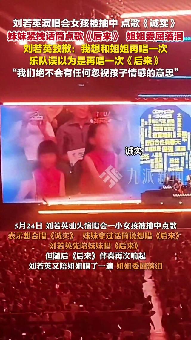 近日,在广东汕头刘若英演唱会上,一小女孩被抽中点歌,表示想合唱《诚实》,一边的妹妹也开口说话想唱《后来》,于是刘若英先陪妹妹唱了一遍《后来》,之后刘若英表示和姐姐再唱一遍,伴奏又响起了《后来》,姐姐唱着唱着没忍住委屈落泪,引发热议。