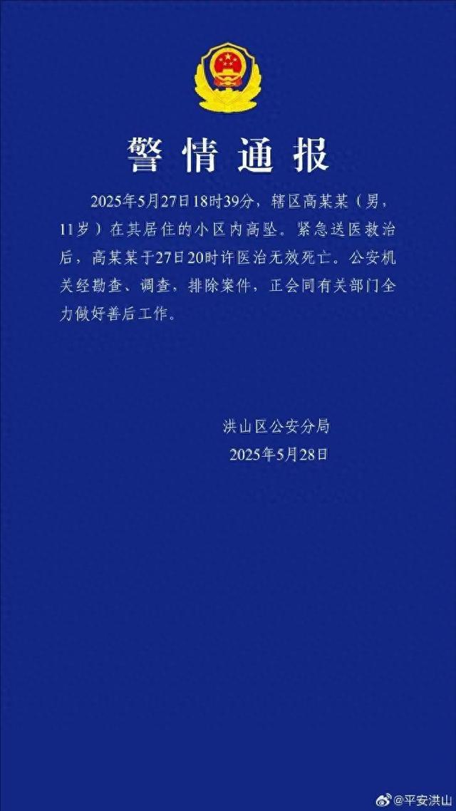 警方通报:高某某(男,11岁)在小区内高坠身亡