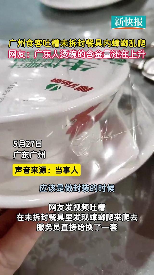 5月27日,广州一网友发视频吐槽在未拆封餐具里发现蟑螂爬来爬去,服务员直接给换了一套。