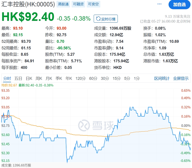 今天,汇丰港股下跌后反弹,收盘时报92.4港元/股,微跌0.38%。