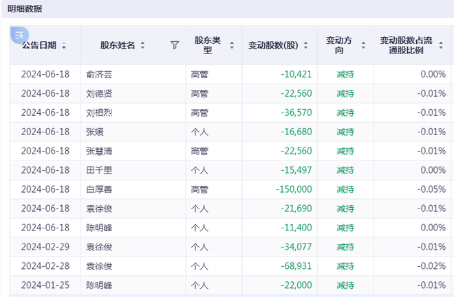 2024年6月,因限制性股票回购注销,白厚善、刘相烈、刘德贤、张慧清、俞济芸五位高管合计减持公司股票约24.21万股,其中白厚善减持股数最多,为15万股。