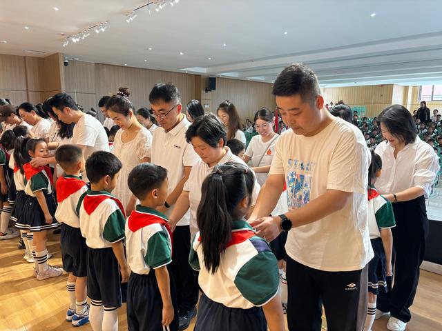 随后,大队辅导员杨娅丽老师宣读新队员名单。在温馨的音乐声中,家长们满怀期待与骄傲,为孩子们佩戴上鲜艳的红领巾。当红领巾飘扬在胸前,新队员们与家长紧紧相拥,这个拥抱传递着爱与鼓励。大队长张钰菡带领新队员庄严宣誓,铿锵有力的誓言展现出他们为共产主义事业贡献力量的决心,誓言铮铮回荡在每个队员心中。