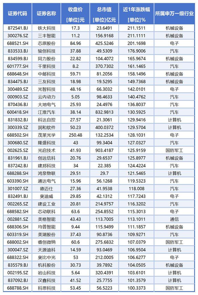 其中,铁大科技、三丰智能、芯原股份股价涨幅位居前三,均超过200%。