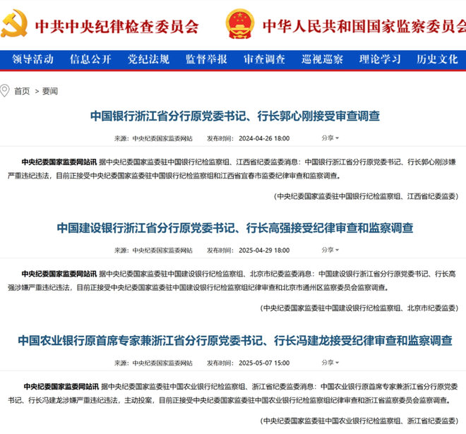 这场反腐行动始于2024年4月中行浙江省分行原行长郭心刚被查,其后建行浙江省分行原行长高强于2025年4月底落马,农行浙江省分行原行长冯建龙则于今年5月初主动投案。