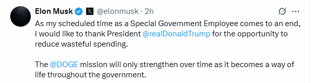 当地时间5月28日,全球首富、美国“政府效率部”负责人埃隆·马斯克在社交平台上宣布,他将正式离开特朗普政府。截至当地时间28日,马斯克在美国“政府效率部(DOGE )”的任期已满128天。按照相关规定,马斯克作为“特殊政府雇员”,在美国政府一年内服务不得超过130天。所以这一次官宣,也算是马斯克如期兑现承诺。2024年美国大选期间,马斯克耗资近3亿美元助力特朗普当选总统。2025年1月20日,自特朗普就职日起,马斯克就以“特殊政府雇员”的身份高调进入华盛顿政坛,他获得了前所未有的权力,也在联邦政府体系内引发了争议与混乱。特朗普曾表示,马斯克是一位伟大的爱国者, “受到一些公众非常不公平的对待”。但特朗普本人已经有一个多月没有在社交平台提及马斯克了,在白宫回答记者相关提问时,也是避不作答。马斯克宣布离职的当天,两人也未进行过正式交谈。对马斯克来说,这场押注特朗普的投资,究竟是亏还是赚呢?1月20日,特朗普正式就任,他在大选期间的亲密盟友马斯克成为“政府效率部”的负责人,在全美掀起一场风暴。马斯克裁掉超10万人但随着改革的深入,马斯克的行为,越来越不能为华盛顿政坛所容忍。报道称,特朗普当时就在现场,双手抱胸,仿佛在观看球赛。当争吵拖得尴尬又漫长时,他才终于插话,说鲁比奥做得“很棒”。特朗普为鲁比奥辩护说:“鲁比奥的工作也很不容易,他要在世界各地到处飞,同时手下还有这么多的部门要兼顾。”但这并没有平息争议。很多共和党议员依然对马斯克表示不满,其中一些人直接向总统投诉。马斯克只能在社交平台上批评了关税计划的核心设计者——白宫贸易顾问彼得·纳瓦罗,他讽刺纳瓦罗的自负多于脑子,“什么像样的东西也没做出来”。据当时听到争吵的消息人士说,现场气氛火爆,一度出现“顶着对方胸口”的场面,甚至在特朗普耳边高声叫嚣。最终,特朗普同意由贝森特举荐的福肯德担任国税局代理局长。特朗普为法案辩护,声称将重新审视其中某些条款:“我们会重新谈判那项法案,我对某些方面不满意,可是对其他方面感到非常振奋。”但他却并未直接回应马斯克的批评。在白宫内部越来越不受欢迎的马斯克,在外部也遭受了大量的批评与反对。他旗下的特斯拉,成为了牺牲品。他们高喊“没有人想投票给埃隆·马斯克”,有些极端人士甚至破坏和焚毁特斯拉汽车。2025年4月,特斯拉在瑞典的汽车销售量暴跌81%,创下自2022年10月以来最低水平。除了瑞典,特斯拉4月在荷兰、丹麦、法国与葡萄牙的销售也出现大幅下滑,分别减少73.8%、67.2%、59.4%和33%。尽管欧洲电动车市场在今年第一季上涨28%,特斯拉却在逆势下滑。投资公司格伯川崎的首席执行官罗斯·格伯表示,“这是我见过的特斯拉有史以来最糟糕的表现”。在Axios Harris Poll对100家最知名美国公司的公众认知调查中,特斯拉曾排名第8,但最近已暴跌至第95位。分析认为,主要原因就是马斯克的煽动性言论和政治活动,包括他在美国“政府效率部”担任的高调角色。何去何从?5月初,马斯克公开承认,对自己的“政绩”并不满意,他没能完全实现自己对美国联邦开支的具体削减目标。知情人士则披露,马斯克在特朗普政府内担任政府效率部负责人的角色让他“精疲力尽、恼怒不已”,特别是相关工作让其旗下企业特斯拉遭受严重冲击。华尔街总算是嗅到了马斯克归来的信号。他们的理由是特斯拉正面临“危机”,部分原因在于马斯克的“缺席”。显然,投资者们无法再忍受这位特斯拉创始人在华盛顿政坛打工的日子了。DOGE团队部分成员对于这批雇员,马斯克曾向特朗普表示,他们将在美国独立宣言签署250周年,即2026年7月4日完全结束任期。