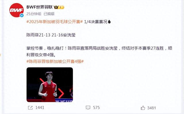 据@BWF世界羽联 最新消息:2025年新加坡羽毛球公开赛1/4决赛赛况:陈雨菲21-13 ,21-16安洗莹。