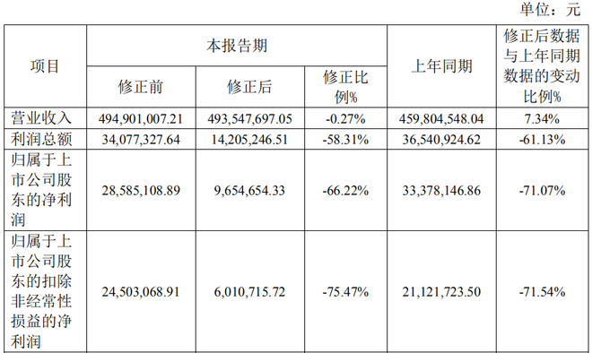 2025年5月16日,公司更新披露《2024年年度业绩快报修正公告》,更正后的归属于母公司所有者的净利润为965.47万元,比修正前减少1,893.05万元,减幅为66.22%。