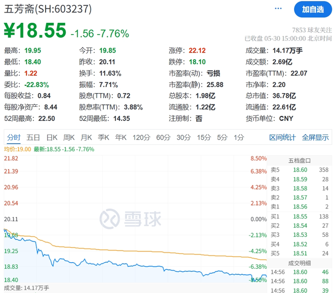今天,五芳斋股价继续下跌,A股收盘时报18.55元/股,跌幅高达7.76%,总市值缩水至36.78亿元。