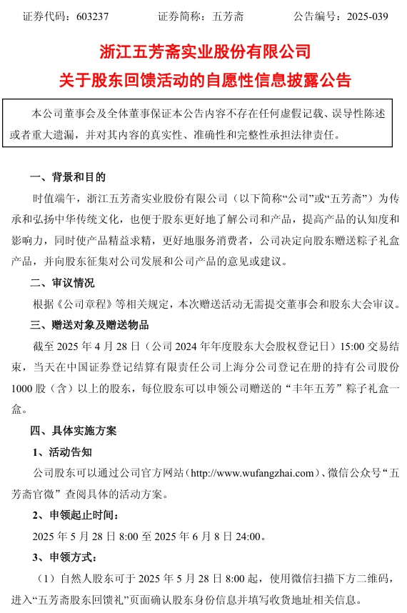 根据公告,凡在2025年4月28日收市时,持有公司1000股及以上的股东,可在5月28日至6月8日期间申领一份“丰年五芳”粽子礼盒。