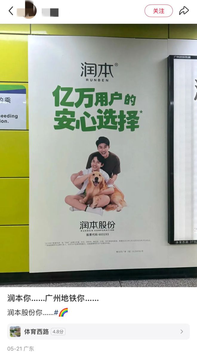 润本股份广州地铁海报引争议!官方说图中两男为父子关系,网友却误认是……