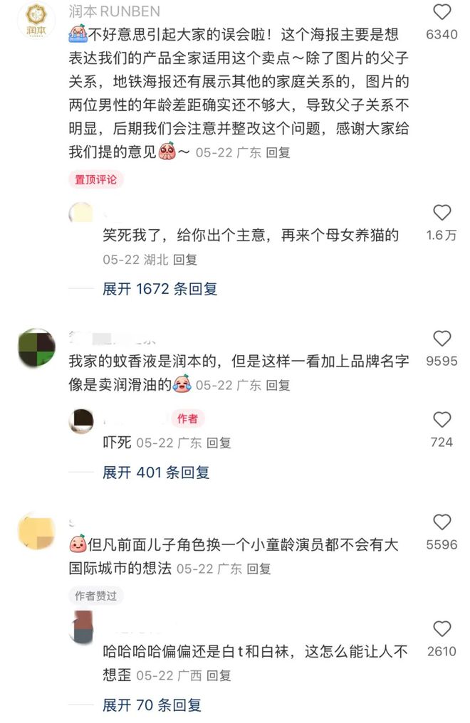 5月21日,相关话题在社交平台发酵。5月22日,润本官方作出回应,解释海报意在突出产品全家适用的卖点,因画面展示人物年龄差距不够大,导致父子关系呈现不明,承诺后期会注意并整改。