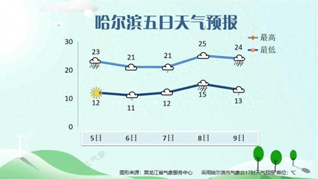 温度方面,未来我省气温波动频繁,全省气温偏低,城市当中以哈尔滨为例,未来几天多降水影响,气温波动下降,夜间最低气温在12℃上下。