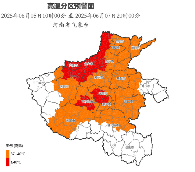 河南省气象台2025年6月5日10时00分发布高温橙色预警:预计6月5日至7日,我省淮河以北大部将持续晴热天气。5日白天,黄河以北和三门峡北部、洛阳北部、郑州、开封、商丘西部最高气温将升至37℃以上,其中洛阳北部、焦作、新乡西部局部最高气温将升至40℃以上。6日白天,黄河以北和三门峡北部、洛阳、郑州、开封、商丘西部、平顶山、许昌、漯河、周口、南阳、驻马店北部最高气温将升至37℃以上,其中安阳西部、新乡西部、焦作、济源、洛阳北部、郑州西部、平顶山中部、许昌西部、漯河北部部分县(市、区)最高气温将升至40℃以上。7日白天,黄河以北和洛阳北部、郑州、开封、商丘西部、平顶山、许昌、漯河、周口、南阳北部、驻马店北部最高气温将升至37℃以上,其中济源、焦作、平顶山东部、许昌、漯河局部最高气温将升至40℃以上。上述地区请注意防范,相邻县(市、区)也需关注。