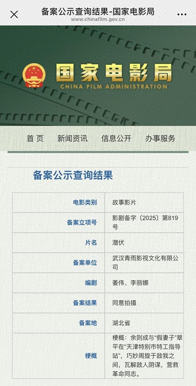 4日,据国家电影局官方网站公布的《国家电影局关于2025年4月下全国电影剧本(梗概)备案、立项公示的通知》显示,电影版《潜伏》已立项。