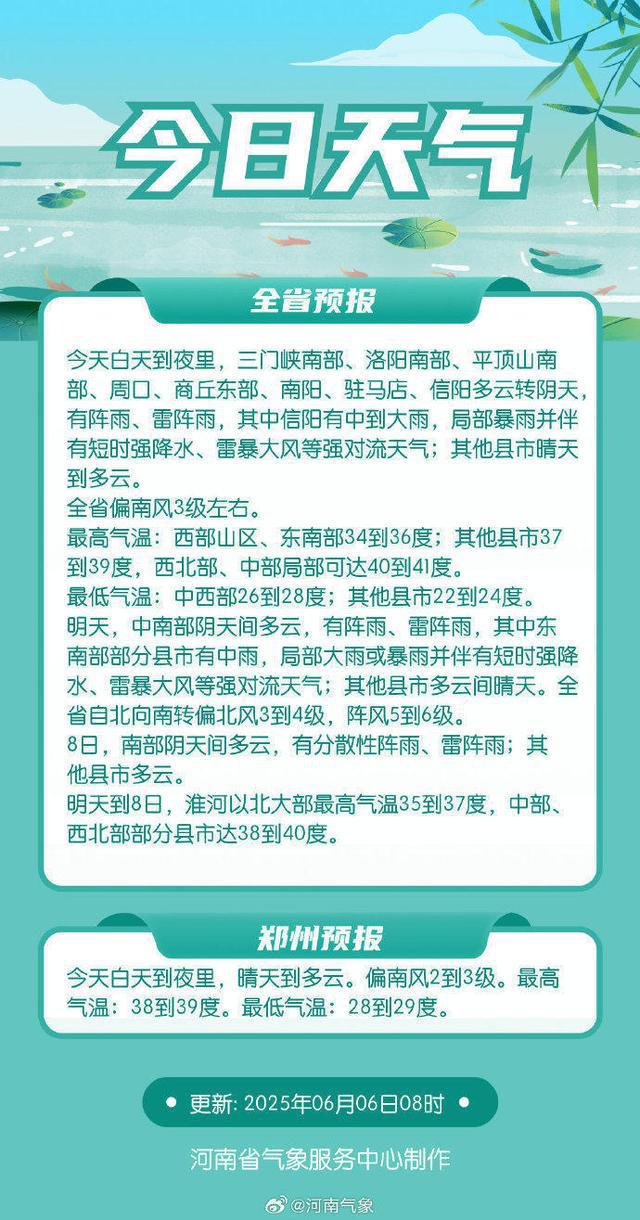 另据河南气象消息,今天白天到夜里,我省西部、南部、东部部分县市有阵雨、雷阵雨,其中信阳有中到大雨,局部暴雨并伴有短时强降水、雷暴大风等强对流天气。