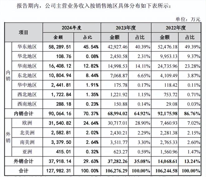 从销售地区分布看,2022年度、2023年度及2024年度,公司境内收入主要来自华东地区(包括山东、江苏、安徽、浙江、福建、江西、上海),占比均超过40%。