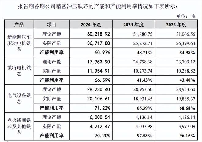 但问题在于,在过去的几年中,华新精科的产能远未达到饱和状态。2024年,公司新能源汽车驱动电机铁芯、微特电机铁芯、电气设备铁芯、点火线圈铁芯及其他铁芯的产能利用率分别约为60.97%、66.59%、71.22%、70.2%。