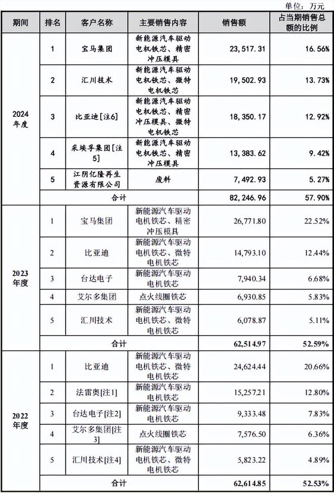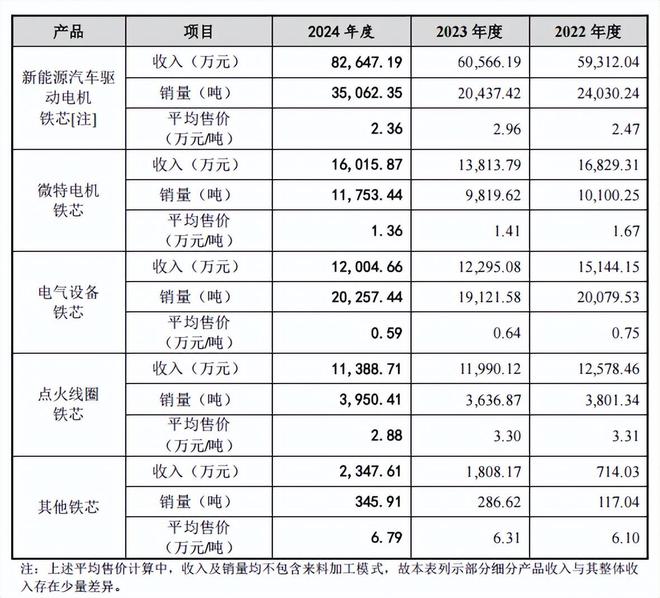 近年来,公司多款主要产品平均售价均出现不同程度的下降。据招股书披露,2024年,公司新能源汽车驱动电机铁芯、微特电机铁芯、电气设备铁芯、点火线圈铁芯的平均售价分别为2.36万元/吨、1.36万元/吨、0.59万元/吨、2.88万元/吨,相较2023年的2.96万元/吨、1.41万元/吨、0.64万元/吨、3.3万元/吨均出现一定程度的下滑。