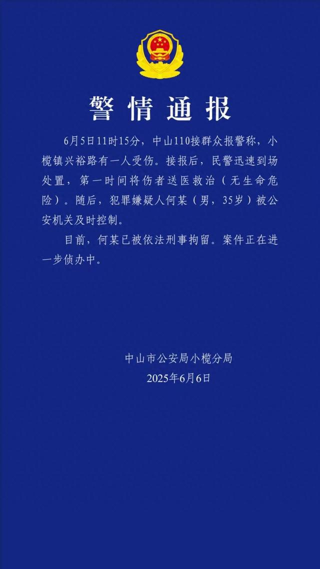 6月5日11时15分,中山110接群众报警称,小榄镇兴裕路有一人受伤。接报后,民警迅速到场处置,第一时间将伤者送医救治(无生命危险)。随后,犯罪嫌疑人何某(男,35岁)被公安机关及时控制。