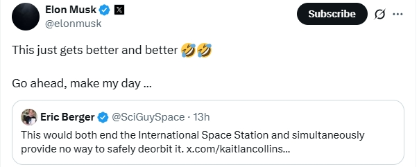 同时,他还转发了一则关于终止政府合同将如何终结国际空间站的言论,并配文“来吧,让我开心一下……”。