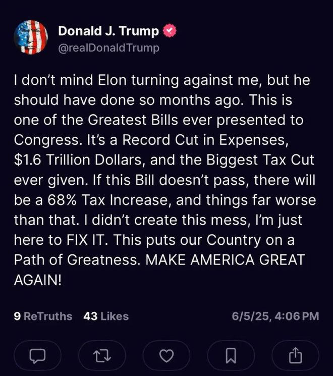 事件的起因可以追溯到马斯克本周二对特朗普政府“大而美”支出法案的激烈批评。