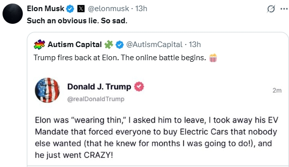 大约10分钟后,马斯克在X上回应特朗普的帖子:“如此明显的谎言。很伤心。”