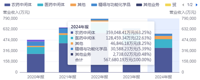 分业务来看,植保板块仍是联化科技的核心支柱,2024年贡献收入35.90亿元,占总营收的63.25%。医药CDMO板块方面,随着全球创新药研发外包需求持续释放,该业务实现营收12.85亿元。