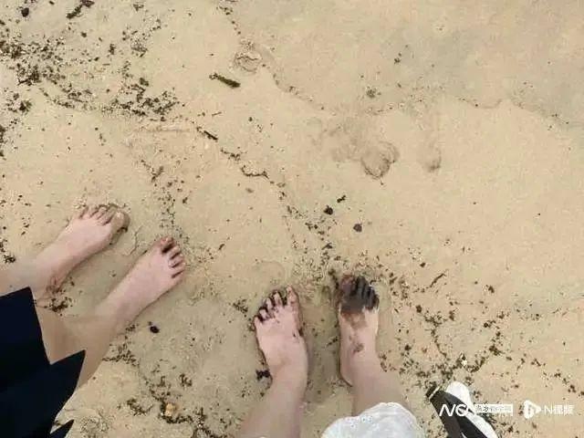 在张女士出示的照片和视频中看出,海水呈现出不均匀的颜色,几处水面漂浮着深褐色的物质,岸边沙滩上则散布着若干大小不一的黑色黏块。“当时还以为是海藻或者垃圾,仔细一看才发现是油状的东西,摸上去很黏,味道也很刺鼻。”