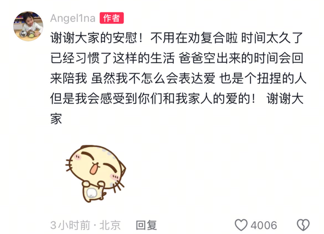甜馨也是第一时间回应大家:不用再劝复合啦,已经习惯这样的生活,爸爸空出来的时间都会回来陪伴自己。