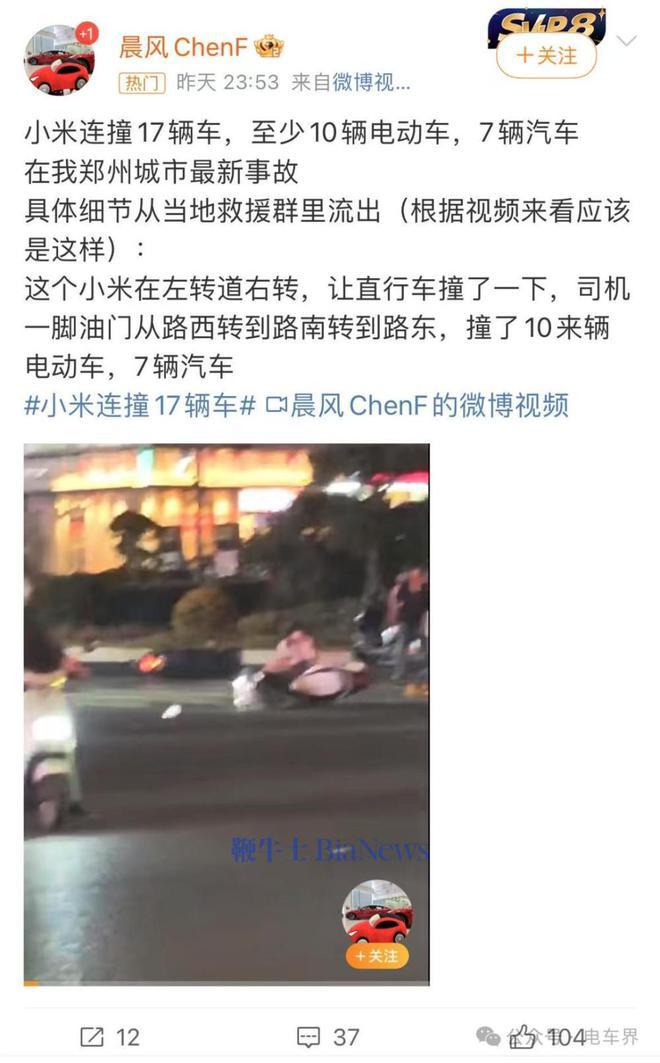一博主爆料,一辆小米SU7连撞17辆车,至少有10辆电动车,7辆汽车。他表示,具体细节是从当地救援群里流出,小米在左转道右转,让直行车撞了一下,司机一脚油门从路西转到路南,再转到路东,撞了10来辆电动车,7辆汽车。